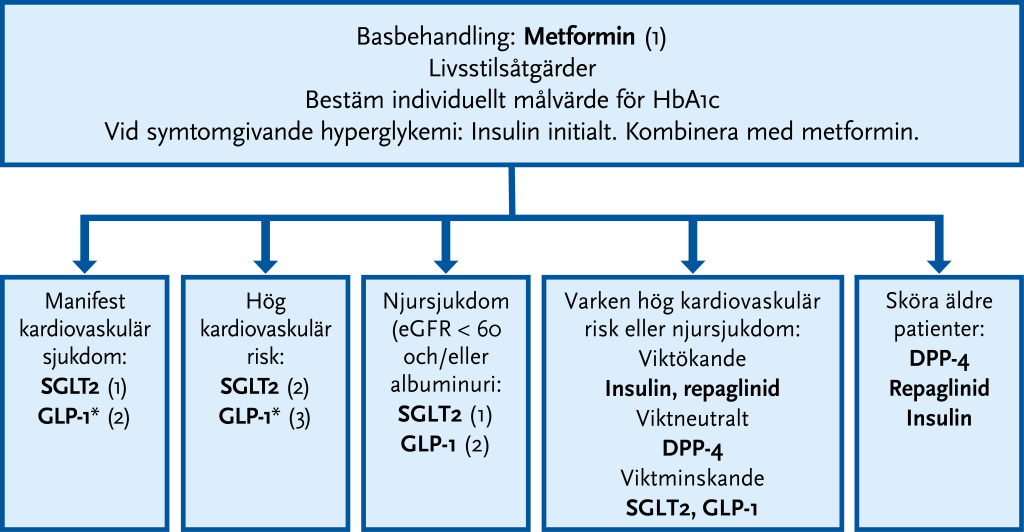 Manifest kardiovaskulär sjukdom och/eller hjärtsvikt: Patienten bör från start erbjudas metformin och SGLT2-hämmare i kombination. I andra hand tillägg av GLP-1-analog subkutant.
